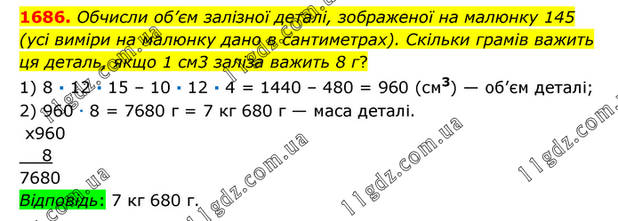 Обчисли об’єм залізної деталі, зображеної на малюнку 145 (усі виміри на малюнку дано в сантиметрах). Скільки грамів важить ця деталь, якщо 1 см3 заліза важить 8 г? 1) 8 ∙ 12 ∙ 15 – 10 ∙ 12 ∙ 4 = 1440 – 480 = 960 (см3) — об’єм деталі; 2) 960 ∙ 8 = 7680 г = 7 кг 680 г — маса деталі. Відповідь: 7 кг 680 г.