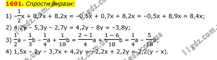 Спрости вирази: 1) –1/2х + 0,7х + 8,2х = –0,5х + 0,7х + 8,2х = –0,5х + 8,9х = 8,4х; 2) 4,2у – 5,3у – 2,7у = 4,2у – 8у = –3,8у; 3) 1/2а – 1/3b – 1/4a + 1/18b = (2 - 1)/4a + (1 - 6)/18b = 1/4a – 5/18b; 4) 1,5х – 2у – 3,7х + 4,2у = –2,2х + 2,2у = 2,2(у – х).