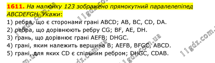 На малюнку 123 зображено прямокутний паралелепіпед ABCDEFGH. Укажи: 1) ребра, що є сторонами грані ABCD; AB, BC, CD, DA. 2) ребра, що дорівнюють ребру CG; BF, AE, DH. 3) грань, що дорівнює грані AEFB; DHGC. 4) грані, яким належить вершина В; AEFB, BFGC, ABCD. 5) грані, для яких CD є спільним ребром; DHGC, CDAB.