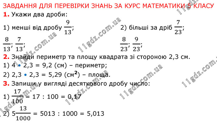 ЗАВДАННЯ ДЛЯ ПЕРЕВІРКИ ЗНАНЬ ЗА КУРС МАТЕМАТИКИ 5 КЛАСУ 1. Укажи два дроби: 1) менші від дробу 9/13; 8/13; 7/13; 2) більші за дріб 7/23; 8/23; 9/23; 2. Знайди периметр та площу квадрата зі стороною 2,3 см. 1) 4 • 2,3 = 9,2 (см) – периметр; 2) 2,3 • 2,3 = 5,29 (см2) – площа. 3. Запиши у вигляді десяткового дробу число: 1) 17/100 = 17 : 100 = 0,17 2) 513/1000 = 5013 : 1000 = 5,013