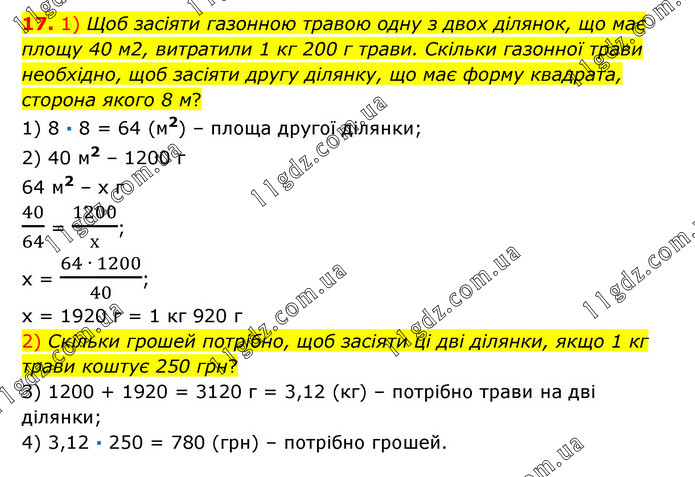 1) Щоб засіяти газонною травою одну з двох ділянок, що має площу 40 м2, витратили 1 кг 200 г трави. Скільки газонної трави необхідно, щоб засіяти другу ділянку, що має форму квадрата, сторона якого 8 м? 1) 8 · 8 = 64 (м2) – площа другої ділянки; 2) 40 м2 – 1200 г 64 м2 – х г 40/64 = 1200/х; х = (64 ∙ 1200)/40; х = 1920 г = 1 кг 920 г 2) Скільки грошей потрібно, щоб засіяти ці дві ділянки, якщо 1 кг трави коштує 250 грн? 3) 1200 + 1920 = 3120 г = 3,12 (кг) – потрібно трави на дві ділянки; 4) 3,12 · 250 = 780 (грн) – потрібно грошей.
