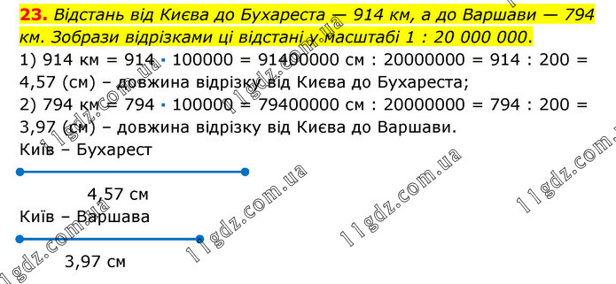 Відстань від Києва до Бухареста — 914 км, а до Bapшави — 794 км. Зобрази відрізками ці відстані у масштабі 1 : 20 000 000. 1) 914 км = 914 · 100000 = 91400000 см : 20000000 = 914 : 200 = 4,57 (см) – довжина відрізку від Києва до Бухареста; 2) 794 км = 794 · 100000 = 79400000 см : 20000000 = 794 : 200 = 3,97 (см) – довжина відрізку від Києва до Варшави.
