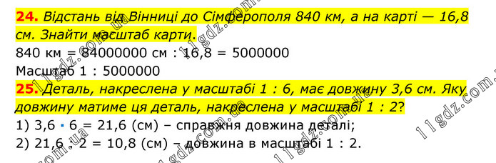 24. Відстань від Вінниці до Сімферополя 840 км, а на карті — 16,8 см. Знайти масштаб карти. 840 км = 84000000 см : 16,8 = 5000000 Масштаб 1 : 5000000 25. Деталь, накреслена у масштабі 1 : 6, має довжину 3,6 см. Яку довжину матиме ця деталь, накреслена у масштабі 1 : 2? 1) 3,6 · 6 = 21,6 (см) – справжня довжина деталі; 2) 21,6 : 2 = 10,8 (см) – довжина в масштабі 1 : 2.