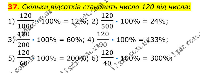 Скільки відсотків становить число 120 від числа: 1) 120/1000 · 100% = 12%; 2) 120/500 · 100% = 24%; 3) 120/200 · 100% = 60%; 4) 120/90 · 100% = 133%; 5) 120/60 · 100% = 200%; 6) 120/40 · 100% = 300%;