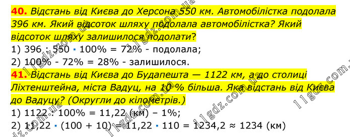 40. Відстань від Києва до Херсона 550 км. Автомобілістка подолала 396 км. Який відсоток шляху подолала автомобілістка? Який відсоток шляху залишилося подолати? 1) 396 : 550 · 100% = 72% - подолала; 2) 100% - 72% = 28% - залишилося. 41. Відстань від Києва до Будапешта — 1122 км, а до столиці Ліхтенштейна, міста Вадуц, на 10 % більша. Яка відстань від Києва до Вадуцу? (Округли до кілометрів.) 1) 1122 : 100% = 11,22 (км) – 1%; 2) 11,22 · (100 + 10) = 11,22 · 110 = 1234,2 ≈ 1234 (км)