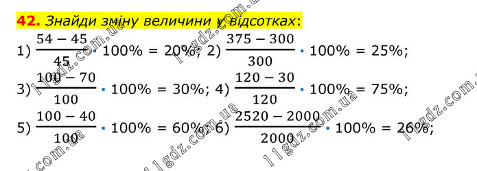 Знайди зміну величини у відсотках: 1) (54 - 45)/45 · 100% = 20%; 2) (375 - 300)/300 · 100% = 25%; 3) (100 - 70)/100 · 100% = 30%; 4) (120 - 30)/120 · 100% = 75%; 5) (100 - 40)/100 · 100% = 60%; 6) (2520 - 2000)/2000 · 100% = 26%;