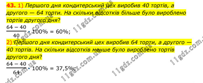 1) Першого дня кондитерський цех виробив 40 тортів, а другого — 64 торти. На скільки відсотків більше було вироблено тортів другого дня? (64 - 40)/40 · 100% = 60%; 2) Першого дня кондитерський цех виробив 64 торти, а другого — 40 тортів. На скільки відсотків менше було вироблено тортів другого дня? (64 - 40)/64 · 100% = 37,5%;