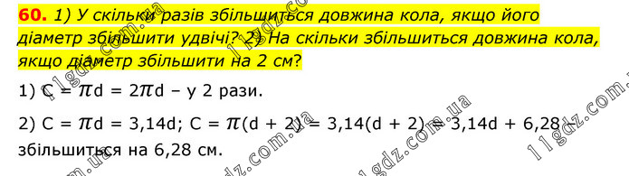 1) У скільки разів збільшиться довжина кола, якщо його діаметр збільшити удвічі? 2) На скільки збільшиться довжина кола, якщо діаметр збільшити на 2 см? 1) С = πd = 2πd – у 2 рази. 2) С = πd = 3,14d; С = π(d + 2) = 3,14(d + 2) = 3,14d + 6,28 – збільшиться на 6,28 см.