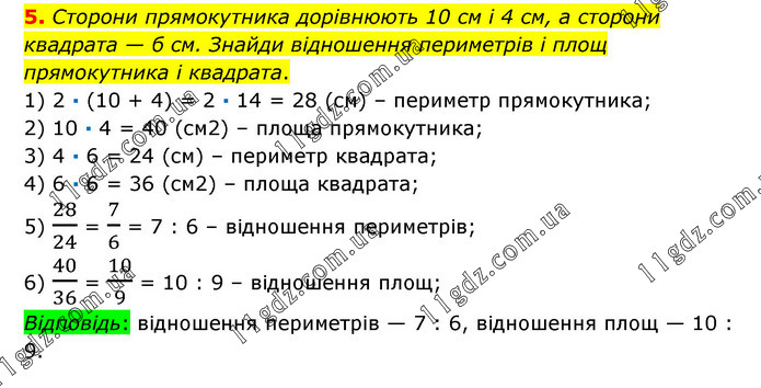 Сторони прямокутника дорівнюють 10 см і 4 см, а сторони квадрата — б см. Знайди відношення периметрів і площ прямокутника і квадрата. 1) 2 · (10 + 4) = 2 · 14 = 28 (см) – периметр прямокутника; 2) 10 · 4 = 40 (см2) – площа прямокутника; 3) 4 · 6 = 24 (см) – периметр квадрата; 4) 6 · 6 = 36 (см2) – площа квадрата; 5) 28/24 = 7/6 = 7 : 6 – відношення периметрів; 6) 40/36 = 10/9 = 10 : 9 – відношення площ; Відповідь: відношення периметрів — 7 : 6, відношення площ — 10 : 9.