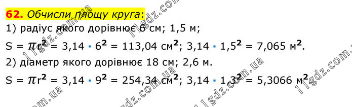 Обчисли площу круга: 1) радіус якого дорівнює 6 см; 1,5 м; S = πr2 = 3,14 · 62 = 113,04 см2; 3,14 · 1,52 = 7,065 м2. 2) діаметр якого дорівнює 18 см; 2,6 м. S = πr2 = 3,14 · 92 = 254,34 см2; 3,14 · 1,32 = 5,3066 м2.