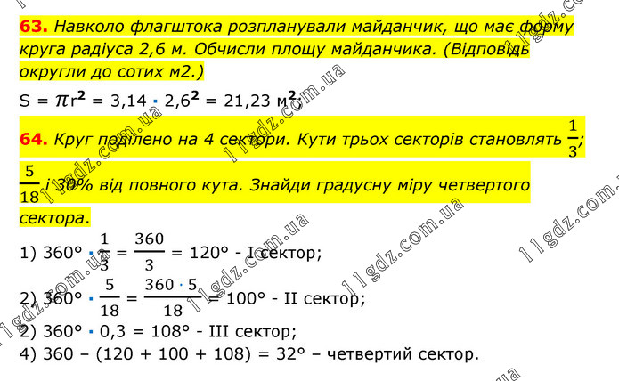 63. Навколо флагштока розпланували майданчик, що має форму круга радіуса 2,6 м. Обчисли площу майданчика. (Відповідь округли до сотих м2.) S = πr2 = 3,14 · 2,62 = 21,23 м2; 64. Круг поділено на 4 сектори. Кути трьох секторів становлять 1/3; 5/18 і 30% від повного кута. Знайди градусну міру четвертого сектора. 1) 360° · 1/3 = 360/3 = 120° - І сектор; 2) 360° · 5/18 = (360 · 5 )/18 = 100° - ІІ сектор; 2) 360° · 0,3 = 108° - ІІІ сектор; 4) 360 – (120 + 100 + 108) = 32° – четвертий сектор.