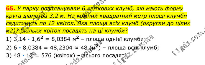 У парку розпланували 6 квіткових клумб, які мають форму круга діаметра 3,2 м. На кожний квадратний метр площі клумби садитимуть по 12 квіток. Яка площа всіх клумб (округли до цілих м2)? Скільки квіток посадять на ці клумби? 1) 3,14 · 1,62 = 8,0384 м2 – площа однієї клумби; 2) 6 · 8,0384 = 48,2304 ≈ 48 (м2) – площа всіх клумб; 3) 48 · 12 = 576 (квіток) – всього посадять.