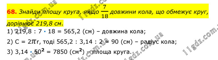Знайди площу круга, якщо 7/18 довжини кола, що обмежує круг, дорівнює 219,8 см. 1) 219,8 : 7 · 18 = 565,2 (см) – довжина кола; 2) С = 2πr, тоді 565,2 : 3,14 : 2 = 90 (см) – радіус кола; 3) 3,14 · 502 = 7850 (см2) – площа круга.