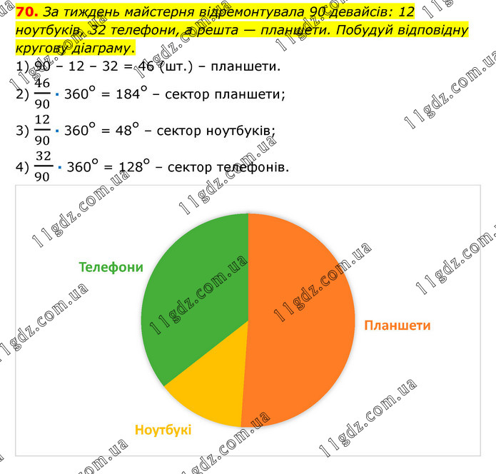 За тиждень майстерня відремонтувала 90 девайсів: 12 ноутбуків, 32 телефони, а решта — планшети. Побудуй відповідну кругову діаграму. 1) 90 – 12 – 32 = 46 (шт.) – планшети. 2) 46/90 · 360° = 184° – сектор планшети; 3) 12/90 · 360° = 48° – сектор ноутбуків; 4) 32/(90 ) · 360° = 128° – сектор телефонів.
