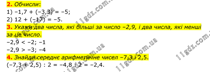 2. Обчисли: 1) –1,7 + (–3,3) = –5; 2) 12 + (–17) = –5. 3. Укажи два числа, які більші за число –2,9, і два числа, які менші за це число. –2,9 < –2; –1 –2,9 > –3; –4 4. Знайди середнє арифметичне чисел –7,3 і 2,5. (–7,3 + 2,5) : 2 = –4,8 : 2 = –2,4.
