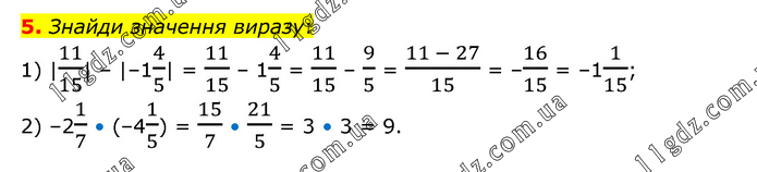 Знайди значення виразу: 1) |11/15| – |–14/5| = 11/15 – 14/5 = 11/15 – 9/5 = (11 - 27)/15 = –16/15 = –11/15; 2) –21/7 • (–41/5) = 15/7 • 21/5 = 3 • 3 = 9.