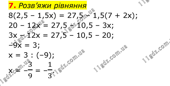 Розв’яжи рівняння 8(2,5 – 1,5х) = 27,5 – 1,5(7 + 2х); 20 – 12х = 27,5 – 10,5 – 3х; 3х – 12х = 27,5 – 10,5 – 20; –9х = 3; х = 3 : (–9); х = –3/9 = –1/3.