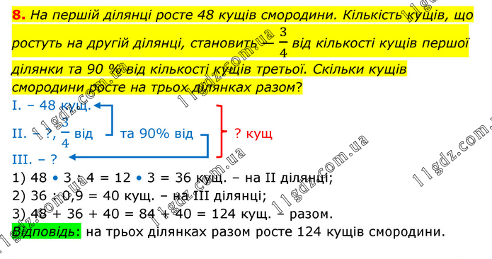 На першій ділянці росте 48 кущів смородини. Кількість кущів, що ростуть на другій ділянці, становить — 3/4 від кількості кущів першої ділянки та 90 % від кількості кущів третьої. Скільки кущів смородини росте на трьох ділянках разом? І. – 48 кущ. ІІ. – ?, 3/4 від та 90% від ? кущ ІІІ. – ? 1) 48 • 3 : 4 = 12 • 3 = 36 кущ. – на ІІ ділянці; 2) 36 : 0,9 = 40 кущ. – на ІІІ ділянці; 3) 48 + 36 + 40 = 84 + 40 = 124 кущ. – разом. Відповідь: на трьох ділянках разом росте 124 кущів смородини.