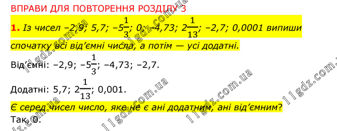 ВПРАВИ ДЛЯ ПОВТОРЕННЯ РОЗДІЛУ 3 1. Із чисел –2,9; 5,7; –51/3; 0; –4,73; 21/13; –2,7; 0,0001 випиши спочатку всі від’ємні числа, а потім — усі додатні. Від’ємні: –2,9; –51/3; –4,73; –2,7. Додатні: 5,7; 21/13; 0,001. Є серед чисел число, яке не є ані додатним, ані від’ємним? Так, 0.