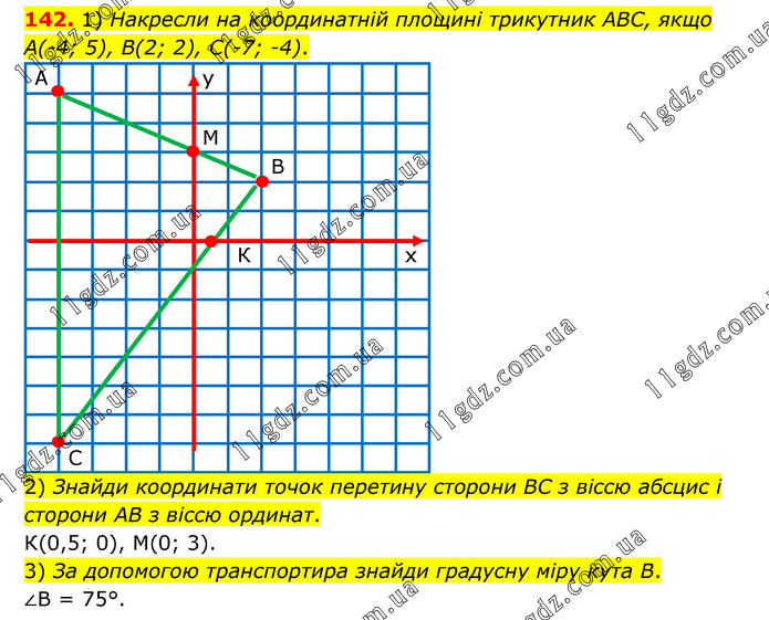 1) Накресли на координатній площині трикутник ABC, якщо А(-4; 5), В(2; 2), С(-7; -4). 2) Знайди координати точок перетину сторони BC з віссю абсцис і сторони AB з віссю ординат. К(0,5; 0), М(0; 3). 3) За допомогою транспортира знайди градусну міру кута В. ∠В = 75°.