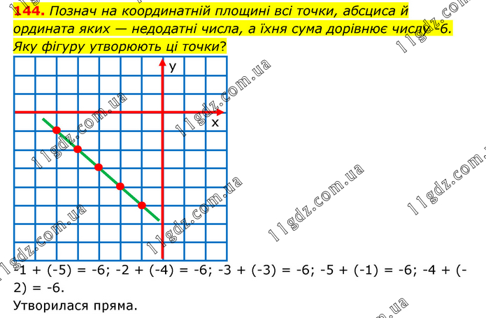 Познач на координатній площині всі точки, абсциса й ордината яких — недодатні числа, а їхня сума дорівнює числу -6. Яку фігуру утворюють ці точки? -1 + (-5) = -6; -2 + (-4) = -6; -3 + (-3) = -6; -5 + (-1) = -6; -4 + (-2) = -6. Утворилася пряма.