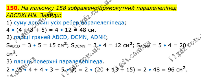 На малюнку 158 зображено прямокутний паралелепіпед ABCDKLMN. Знайди: 1) суму довжин усіх ребер паралелепіпеда; 4 • (4 + 3 + 5) = 4 • 12 = 48 см. 2) площі граней ABCD, DCMN, ADNК; SABCD = 3 • 5 = 15 см2; SDCMN = 3 • 4 = 12 см2; SADNK = 5 • 4 = 20 см2. 3) площу поверхні паралелепіпеда. 2 • (5 • 4 + 4 • 3 + 5 • 3) = 2 • (20 + 13 + 15) = 2 • 48 = 96 см2.