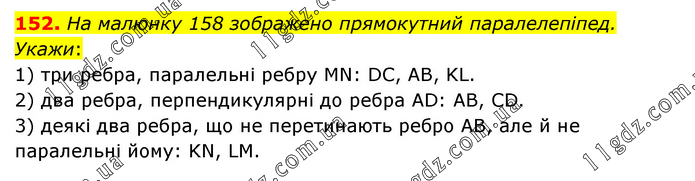 На малюнку 158 зображено прямокутний паралелепіпед. Укажи: 1) три ребра, паралельні ребру MN: DC, AB, KL. 2) два ребра, перпендикулярні до ребра AD: AB, CD. 3) деякі два ребра, що не перетинають ребро AB, але й не паралельні йому: KN, LM.