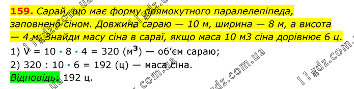 Сарай, що має форму прямокутного паралелепіпеда, заповнено сіном. Довжина сараю — 10 м, ширина — 8 м, а висота — 4 м. Знайди масу сіна в сараї, якщо маса 10 м3 сіна дорівнює 6 ц. 1) V = 10 ∙ 8 ∙ 4 = 320 (м3) — об’єм сараю; 2) 320 : 10 ∙ 6 = 192 (ц) — маса сіна. Відповідь: 192 ц.