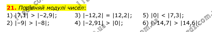 Порівняй модулі чисел: 1) |7,1| > |–2,9|; 2) |–9| > |–8|; 3) |–12,2| = |12,2|; 4) |–2,91| > |0|; 5) |0| < |7,3|; 6) |–14,7| > |14,6|.