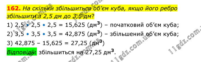 На скільки збільшиться об’єм куба, якщо його ребро збільшити з 2,5 дм до 3,5 дм? 1) 2,5 • 2,5 • 2,5 = 15,625 (дм3) – початковий об’єм куба; 2) 3,5 • 3,5 • 3,5 = 42,875 (дм3) – збільшений об’єм куба; 3) 42,875 – 15,625 = 27,25 (дм3) Відповідь: збільшиться на 27,25 дм3.
