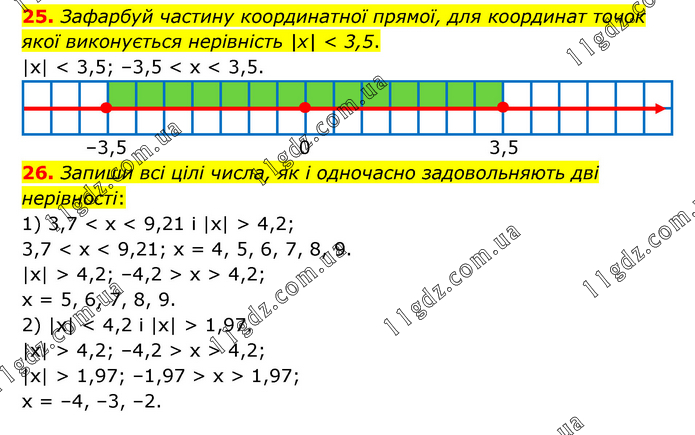 Зафарбуй частину координатної прямої, для координат точок якої виконується нерівність |х| < 3,5. |х| < 3,5; –3,5 < х < 3,5. 26. Запиши всі цілі числа, як і одночасно задовольняють дві нерівності: 1) 3,7 < х < 9,21 і |х| > 4,2; 3,7 < х < 9,21; х = 4, 5, 6, 7, 8, 9. |х| > 4,2; –4,2 > х > 4,2; х = 5, 6, 7, 8, 9. 2) |х| < 4,2 і |х| > 1,97. |х| > 4,2; –4,2 > х > 4,2; |х| > 1,97; –1,97 > х > 1,97; х = –4, –3, –2.
