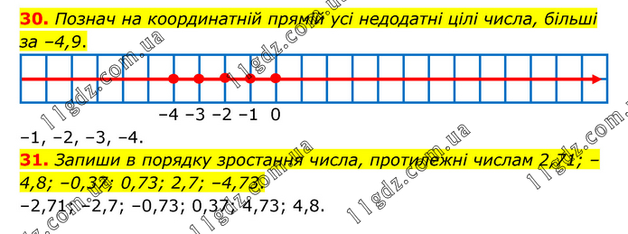 30. Познач на координатній прямій усі недодатні цілі числа, більші за –4,9. –1, –2, –3, –4. 31. Запиши в порядку зростання числа, протилежні числам 2,71; –4,8; –0,37; 0,73; 2,7; –4,73. –2,71; –2,7; –0,73; 0,37; 4,73; 4,8.