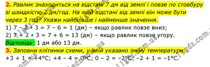 2. Равлик знаходиться на відстані 7 дм від землі і повзе по стовбуру зі швидкістю 2 дм/год. На якій відстані від землі він може бути через 3 год? Укажи найбільше і найменше значення. 1) 7 – 2 • 3 = 7 – 6 = 1 (дм) – якщо равлик повзе вниз; 2) 7 + 2 • 3 = 7 + 6 = 13 (дм) – якщо равлик повзе угору. Відповідь: 1 дм або 13 дм. 3. Заповни клітинки схеми, у якій указано зміну температури. +3 + 1 = +4°С; +4 – 4 = 0°С; 0 – 2 = –2°С; –2 + 1 = –1°С.