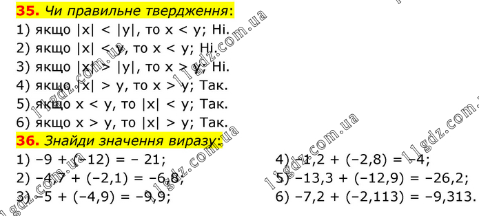35. Чи правильне твердження: 1) якщо |х| < |у|, то х < у; Ні. 2) якщо |x| < у, то х < у; Ні. 3) якщо |х| > |у|, то х > у; Ні. 4) якщо |х| > у, то х > у; Так. 5) якщо х < у, то |х| < у; Так. 6) якщо х > у, то |х| > у; Так. 36. Знайди значення виразу: 1) –9 + (–12) = – 21; 2) –4,7 + (–2,1) = –6,8; 3) –5 + (–4,9) = –9,9; 4) –1,2 + (–2,8) = –4; 5) –13,3 + (–12,9) = –26,2; 6) –7,2 + (–2,113) = –9,313.