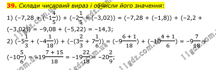 Склади числовий вираз і обчисли його значення: 1) (–7,28 + (–14/5)) + (–21/5 + (–3,02)) = (–7,28 + (–1,8)) + (–2,2 + (–3,02)) = –9,08 + (–5,22) = –14,3; 2) (–51/3 + (–41/18)) + (–(32/3 + 71/6)) = (–9(6 + 1)/18) + (–10(4 + 1)/6) = –97/18 + (–105/6) = –19(7 + 15)/18 = –1922/18 = –202/9;
