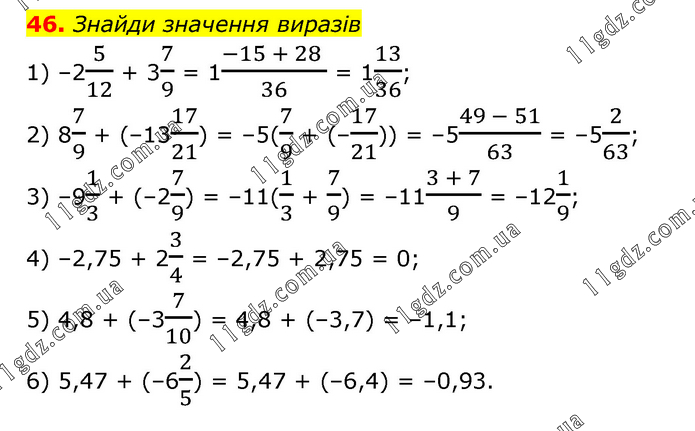 Знайди значення виразів 1) –25/12 + 37/9 = 1(-15 + 28 )/36 = 113/36; 2) 87/9 + (–1317/21) = –5(7/9 + (–17/21)) = –5(49 - 51)/63 = –52/63; 3) –91/3 + (–27/9) = –11(1/3 + 7/9) = –11(3 + 7)/9 = –121/9; 4) –2,75 + 23/4 = –2,75 + 2,75 = 0; 5) 4,8 + (–37/10) = 4,8 + (–3,7) = –1,1; 6) 5,47 + (–62/5) = 5,47 + (–6,4) = –0,93.