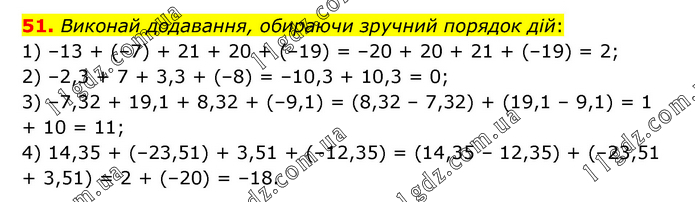 Виконай додавання, обираючи зручний порядок дій: 1) –13 + (–7) + 21 + 20 + (–19) = –20 + 20 + 21 + (–19) = 2; 2) –2,3 + 7 + 3,3 + (–8) = –10,3 + 10,3 = 0; 3) –7,32 + 19,1 + 8,32 + (–9,1) = (8,32 – 7,32) + (19,1 – 9,1) = 1 + 10 = 11; 4) 14,35 + (–23,51) + 3,51 + (–12,35) = (14,35 – 12,35) + (–23,51 + 3,51) = 2 + (–20) = –18.