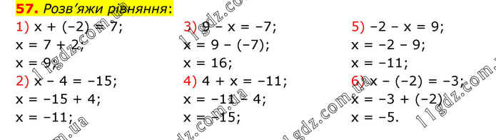 Розв’яжи рівняння: 1) х + (–2) = 7; х = 7 + 2; х = 9; 2) х – 4 = –15; х = –15 + 4; х = –11; 3) 9 – х = –7; х = 9 – (–7); х = 16; 4) 4 + х = –11; х = –11 – 4; х = –15; 5) –2 – х = 9; х = –2 – 9; х = –11; 6) х – (–2) = –3; х = –3 + (–2) х = –5.
