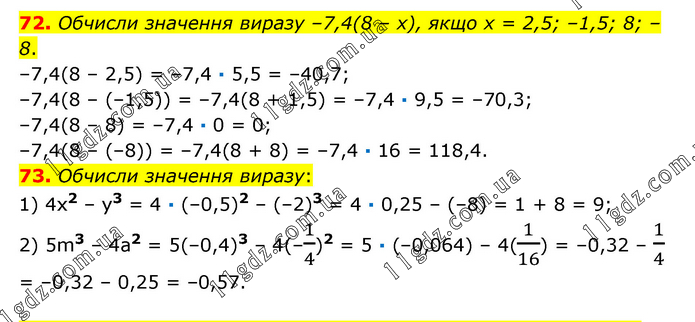 72. Обчисли значення виразу –7,4(8 – х), якщо х = 2,5; –1,5; 8; –8. –7,4(8 – 2,5) = –7,4 ∙ 5,5 = –40,7; –7,4(8 – (–1,5)) = –7,4(8 + 1,5) = –7,4 ∙ 9,5 = –70,3; –7,4(8 – 8) = –7,4 ∙ 0 = 0; –7,4(8 – (–8)) = –7,4(8 + 8) = –7,4 ∙ 16 = 118,4. 73. Обчисли значення виразу: 1) 4х2 – у3 = 4 ∙ (–0,5)2 – (–2)3 = 4 ∙ 0,25 – (–8) = 1 + 8 = 9; 2) 5m3 – 4a2 = 5(–0,4)3 – 4(–1/4)2 = 5 ∙ (–0,064) – 4(1/16) = –0,32 – 1/4 = –0,32 – 0,25 = –0,57.