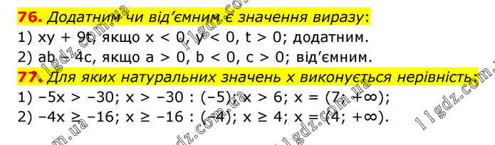 76. Додатним чи від’ємним є значення виразу: 1) ху + 9t, якщо х < 0, у < 0, t > 0; додатним. 2) ab – 4с, якщо а > 0, b < 0, с > 0; від’ємним. 77. Для яких натуральних значень х виконується нерівність: 1) –5x > –30; x > –30 : (–5); x > 6; x = (7; +∞); 2) –4x ≥ –16; х ≥ –16 : (–4); х ≥ 4; х = (4; +∞).