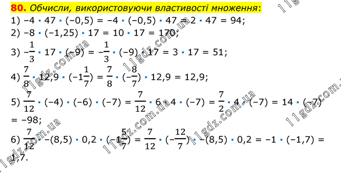Обчисли, використовуючи властивості множення: 1) –4 ∙ 47 ∙ (–0,5) = –4 ∙ (–0,5) ∙ 47 = 2 ∙ 47 = 94; 2) –8 ∙ (–1,25) ∙ 17 = 10 ∙ 17 = 170; 3) –1/3 ∙ 17 ∙ (–9) = –1/3 ∙ (–9) ∙ 17 = 3 ∙ 17 = 51; 4) 7/8 ∙ 12,9 ∙ (–11/7) = 7/8 ∙ (–8/7) ∙ 12,9 = 12,9; 5) 7/12 ∙ (–4) ∙ (–6) ∙ (–7) = 7/12 ∙ 6 ∙ 4 ∙ (–7) = 7/2 ∙ 4 ∙ (–7) = 14 ∙ (–7) = –98; 6) 7/12 ∙ –(8,5) ∙ 0,2 ∙ (–15/7) = 7/12 ∙ (–12/7) ∙ –(8,5) ∙ 0,2 = –1 ∙ (–1,7) = 1,7.