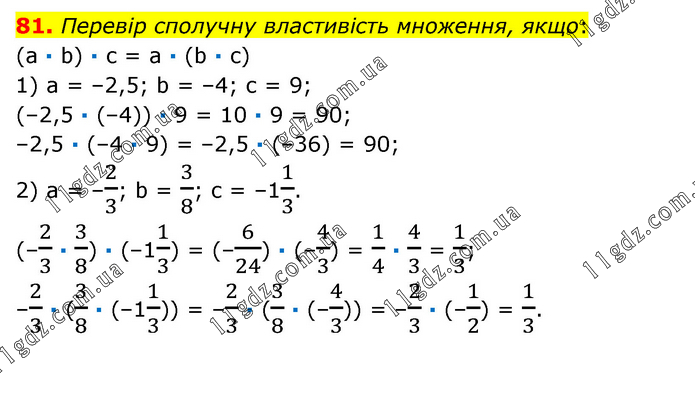 Перевір сполучну властивість множення, якщо: (a ∙ b) ∙ c = a ∙ (b ∙ c) 1) а = –2,5; b = –4; с = 9; (–2,5 ∙ (–4)) ∙ 9 = 10 ∙ 9 = 90; –2,5 ∙ (–4 ∙ 9) = –2,5 ∙ (–36) = 90; 2) a = –2/3; b = 3/8; c = –11/3. (–2/3 ∙ 3/8) ∙ (–11/3) = (–6/24) ∙ (–4/3) = 1/4 ∙ 4/3 = 1/3; –2/3 ∙ (3/8 ∙ (–11/3)) = –2/3 ∙ (3/8 ∙ (–4/3)) = –2/3 ∙ (–1/2) = 1/3.