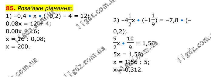 Розв’яжи рівняння: 1) –0,4 • х • (–0,2) – 4 = 12; 0,08х = 12 + 4; 0,08х = 16; х = 16 : 0,08; х = 200. 2) –41/2х • (–11/9) = –7,8 • (–0,2); 9/2х • 10/9 = 1,56; 5х = 1,56; х = 1,56 : 5; х = 0,312.