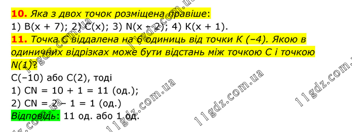 10. Яка з двох точок розміщена правіше: 1) В(х + 7); 2) С(х); 3) N(x – 2); 4) К(х + 1). 11. Точка C віддалена на 6 одиниць від точки К (–4). Якою в одиничних відрізках може бути відстань між точкою C і точкою N(1)? C(–10) або С(2), тоді 1) CN = 10 + 1 = 11 (од.); 2) CN = 2 – 1 = 1 (од.) Відповідь: 11 од. або 1 од.