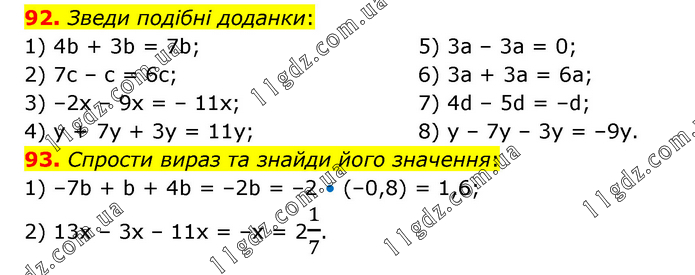 92. Зведи подібні доданки: 1) 4b + 3b = 7b; 2) 7c – c = 6c; 3) –2x – 9x = – 11x; 4) y + 7y + 3y = 11y; 5) 3a – 3a = 0; 6) 3a + 3a = 6a; 7) 4d – 5d = –d; 8) y – 7y – 3y = –9y. 93. Спрости вираз та знайди його значення: 1) –7b + b + 4b = –2b = –2 • (–0,8) = 1,6; 2) 13x – 3х – 11х = –х = 21/7.