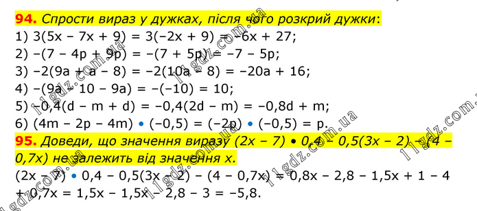 94. Спрости вираз у дужках, після чого розкрий дужки: 1) 3(5х – 7х + 9) = 3(–2х + 9) = –6х + 27; 2) –(7 – 4р + 9р) = –(7 + 5р) = –7 – 5р; 3) –2(9а + а – 8) = –2(10а – 8) = –20а + 16; 4) –(9а – 10 – 9а) = –(–10) = 10; 5) –0,4(d – m + d) = –0,4(2d – m) = –0,8d + m; 6) (4m – 2p – 4m) • (–0,5) = (–2p) • (–0,5) = р. 95. Доведи, що значення виразу (2х – 7) • 0,4 – 0,5(3х – 2) – (4 – 0,7х) не залежить від значення х. (2х – 7) • 0,4 – 0,5(3х – 2) – (4 – 0,7х) = 0,8х – 2,8 – 1,5х + 1 – 4 + 0,7х = 1,5х – 1,5х – 2,8 – 3 = –5,8.