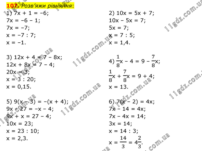Розв’яжи рівняння: 1) 7х + 1 = –6; 7х = –6 – 1; 7х = –7; х = –7 : 7; х = –1. 2) 10x = 5х + 7; 10х – 5х = 7; 5х = 7; х = 7 : 5; х = 1,4. 3) 12х + 4 = 7 – 8х; 12х + 8х = 7 – 4; 20х = 3; х = 3 : 20; х = 0,15. 4) 1/8х – 4 = 9 – 7/8х; 1/8х + 7/8х = 9 + 4; х = 13. 5) 9(х – 3) = –(х + 4); 9х – 27 = –х – 4; 9х + х = 27 – 4; 10х = 23; х = 23 : 10; х = 2,3. 6) 7(х – 2) = 4х; 7х – 14 = 4х; 7х – 4х = 14; 3х = 14; х = 14 : 3; х = 14/3 = 42/3.