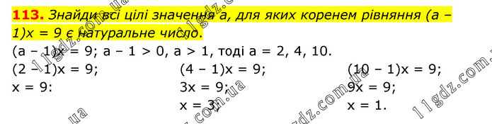 Знайди всі цілі значення а, для яких коренем рівняння (а – 1)х = 9 є натуральне число. (а – 1)х = 9; а – 1 > 0, а > 1, тоді а = 2, 4, 10. (2 – 1)х = 9; х = 9: (4 – 1)х = 9; 3х = 9; х = 3; (10 – 1)х = 9; 9х = 9; х = 1.