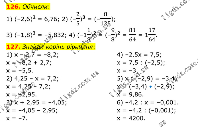 126. Обчисли: 1) (–2,6)2 = 6,76; 2) (–2/5)3 = (–8/125); 3) (–1,8)3 = –5,832; 4) (–11/8)2 = (–9/8)2 = 81/64 = 117/64. 127. Знайди корінь рівняння: 1) х – 2,7 = –8,2; х = –8,2 + 2,7; х = –5,5. 2) 4,25 – х = 7,2; х = 4,25 – 7,2; х = –2,95. 3) х + 2,95 = –4,05; х = –4,05 – 2,95; х = –7. 4) –2,5х = 7,5; х = 7,5 : (–2,5); х = –3. 5) х : (–2,9) = –3,4; х = (–3,4) • (–2,9); х = 9,86. 6) –4,2 : х = –0,001. х = –4,2 : (–0,001); х = 4200.