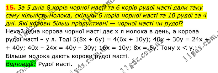 За 5 днів 8 корів чорної масті та 6 корів рудої масті дали таку саму кількість молока, скільки 6 корів чорної масті та 10 рудої за 4 дні. Які корови більш продуктивні — чорної масті чи рудої? Нехай одна корова чорної масті дає х л молока в день, а корова рудої масті – у л. Тоді 5(8х + 6у) = 4(6х + 10у); 40х + 30у = 24х + + 40у; 40х – 24х = 40у – 30у; 16х = 10у; 8х = 5у. Тому х < у. Більше молока дають корови рудої масті. Відповідь: Рудої масті.